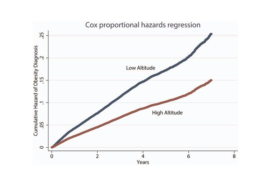 爲保證結果的嚴謹性,科研人員在控制了服役部門、服役時間、職業、性別、種族、年齡等因素後,結果發現,相比於低海拔地區的服役人員,駐紮在高海拔地區的服役人員的肥胖風險率下降了 41%。