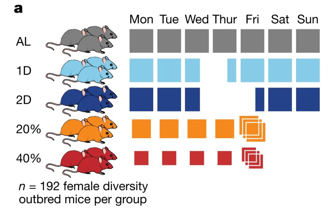 此次《Nature》論文卻給出了不一樣的結論。在這項研究中,團隊將960只小鼠隨機分配爲5組,每組小鼠接受五種飲食中的一種:無限制飲食,每週禁食一天,每週連續禁食二天,以及兩種熱量限制——八分飽(熱量攝入比基線低20%)和六分飽(熱量攝入比基線低40%)。