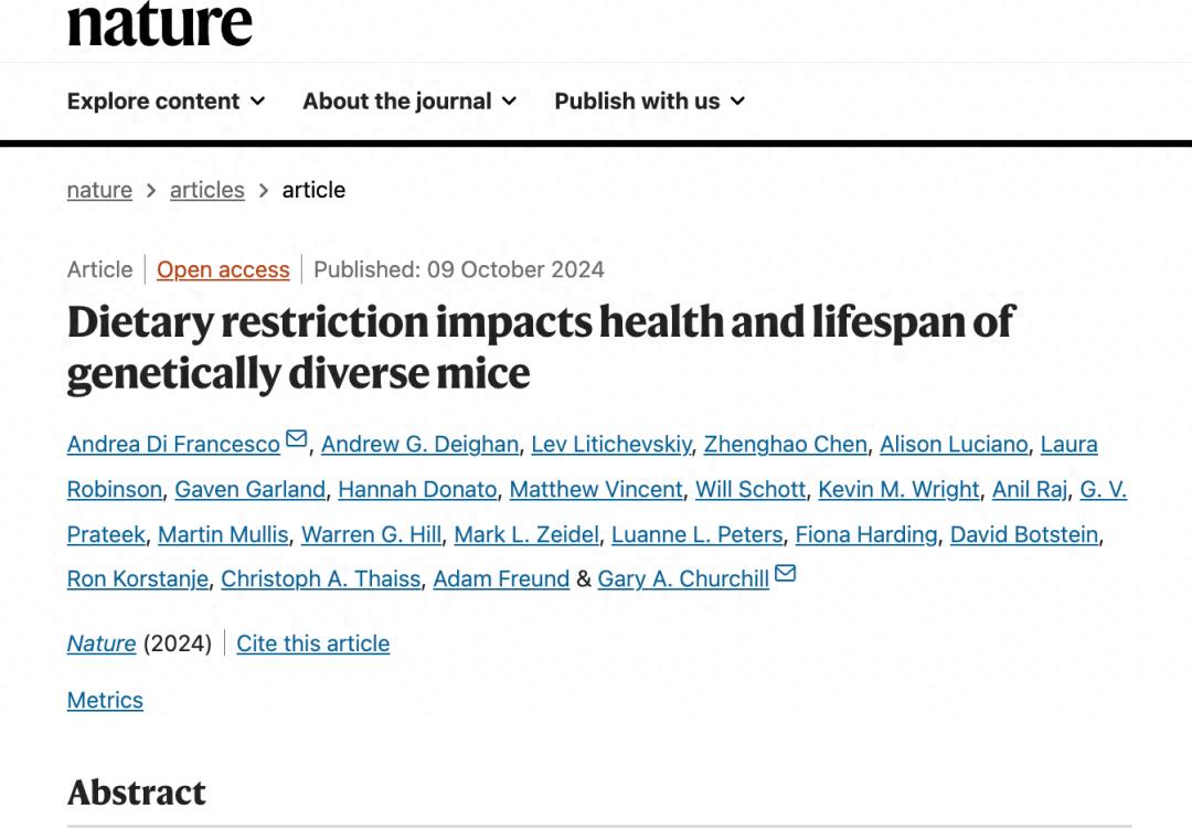 谷歌旗下明星公司Calico Life Sciences聯合美國傑克遜實驗室、賓夕法尼亞大學的研究人員,在國際頂尖學術期刊 《Nature》上發表了一篇重磅論文,首度揭示飲食限制與長壽健康之間的複雜關係。