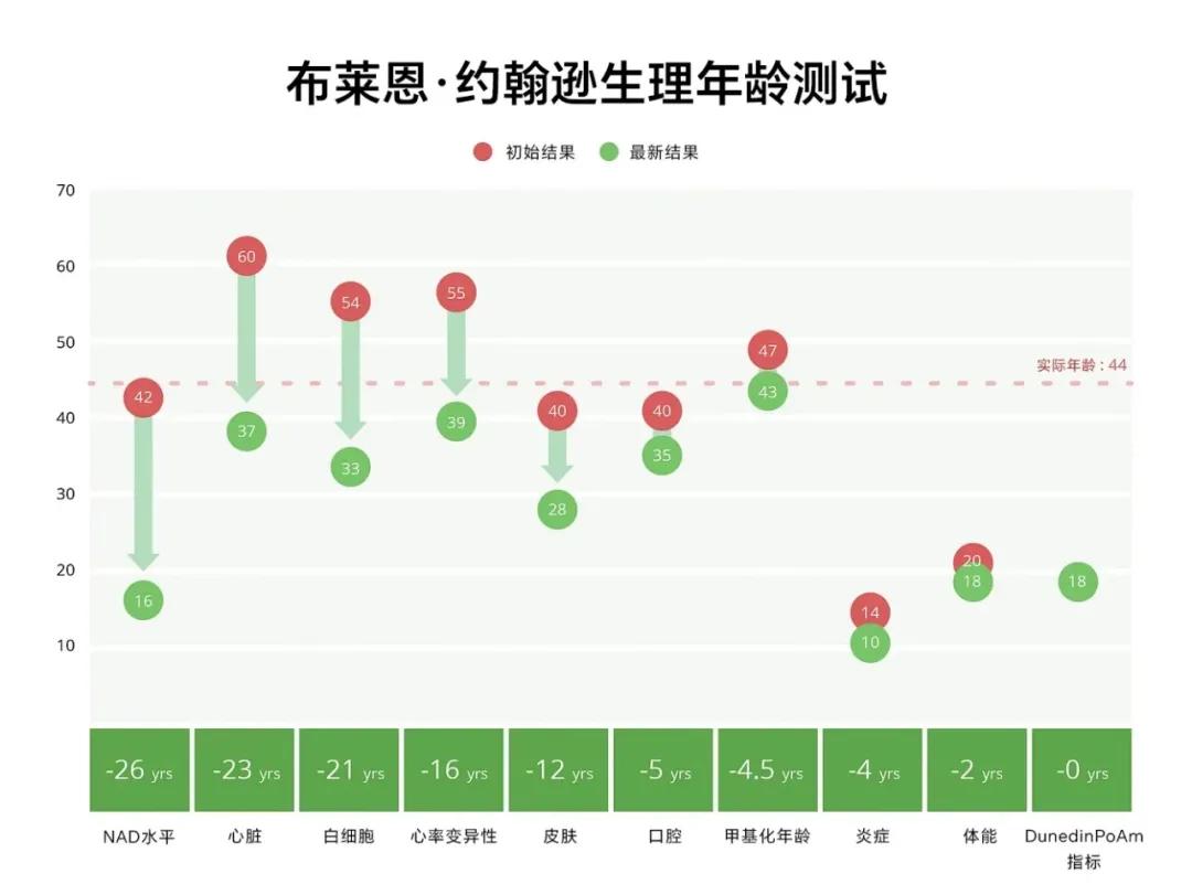 大衛·辛克萊的生理年齡檢測顯示,在進行系統干預後,他比實際年齡年輕了17.6歲;硅谷億萬富翁布萊恩·約翰遜,經過爲他量身定製的 “藍圖”計劃後,7個月年輕了5.1歲……
