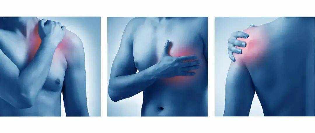 ●心梗:多因勞累、暴飲暴食等誘發,出現突然肩膀疼或左臂疼,同時伴有胸部放射痛,一般會持續30分鐘或更長時間,並伴有噁心、嘔吐、心慌。