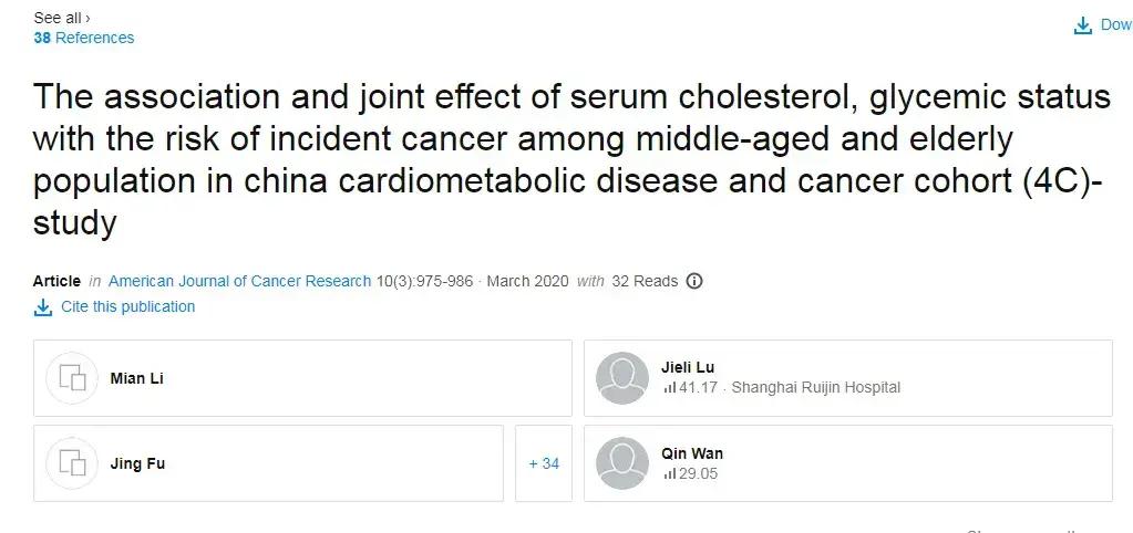 此前,上海交通大學醫學院附屬瑞金醫院的研究人員發表在《美國癌症研究雜誌》的一項研究,研究人員對我國在2014~2016年的多個心血管代謝病、癌症隊列研究項目進行了薈萃分析,涉及全國16個省市、20個社區站點的13.8萬名受試者進行了中位3.8年的隨訪。