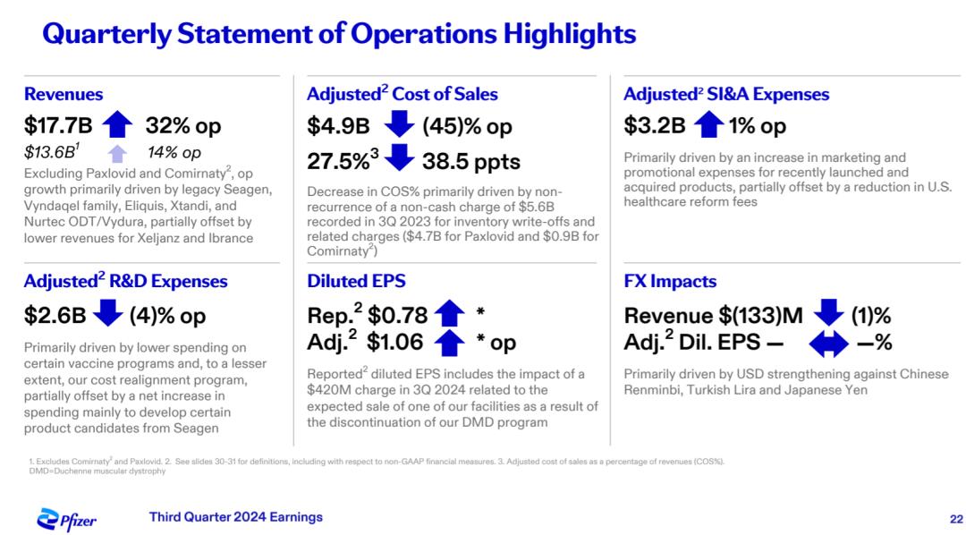 輝瑞(PFE)發佈的 Q3 財報顯示,2024 財年前三財季累計收入 458.64 億美元,較去年同期的 449.84 億美元同比增長 1.96%;累計淨利潤 76.44 億美元,對比去年同期 55.18 億美元同比增長 38.53%。