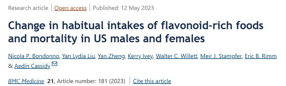 10.1038/s41387-024-00288-03、 Bondonno, N.P., Liu, Y.L., Zheng, Y. et al. Change in habitual intakes of flavonoid-rich foods and mortality in US males and females. BMC Med 2023. Doi: