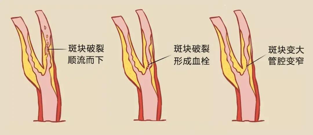 斑塊破裂後,凝血因子等忙着修復止血,會在附近形成血栓,一旦它們順流而下,就可能將血管徹底堵死,器官缺少血氧供應,就會壞死。