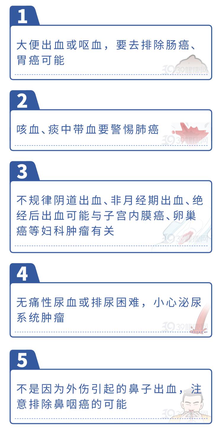 原因可能是腫瘤組織的生長侵犯到血管,導致破裂出血,也可能是腫瘤組織生長過於旺盛,自身破潰出血,不同癌症有所不同,如有下面這些情況,就要注意了: