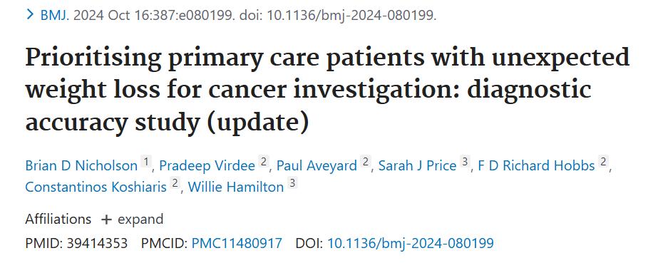 1. Nicholson BD, Virdee P, Aveyard P, et al.“ Prioritising primary care patients with unexpected weight loss for cancer investigation: diagnostic accuracy study (update).” BMJ. 2024 Oct 16;387:e080199. doi: 10.1136/bmj-2024-080199.