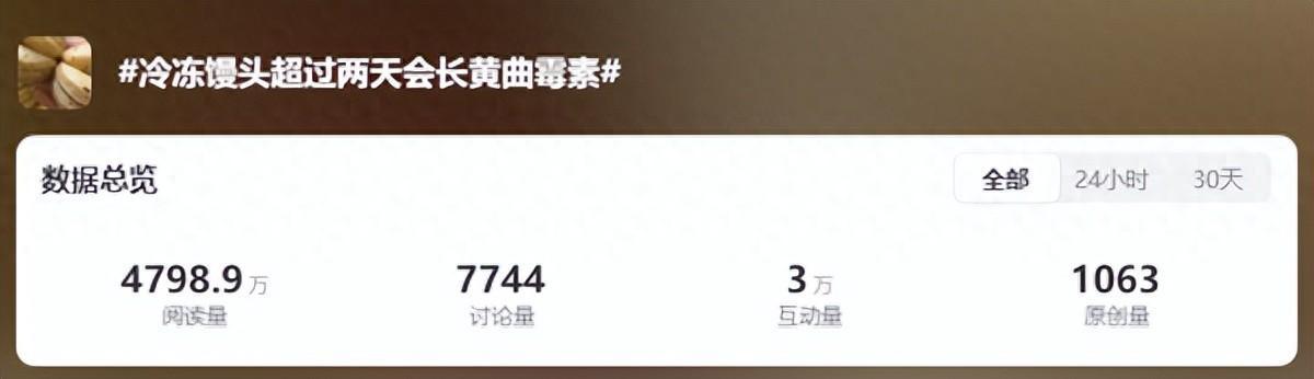 11月11日,一則“冷凍饅頭超過兩天會長黃麴黴素”的消息衝上微博熱搜。其源頭爲一條抖音短視頻,稱浙江大學研究發現,冷凍饅頭不能喫,因爲饅頭在室溫下儲存超過1天,就會滋生黴菌,進入冷凍環境後,黴菌生長速度會減緩,但並不會完全停止。特別是反覆冷凍解凍的過程,會加速饅頭表面水分的凝結,爲黴菌生長創造條件。