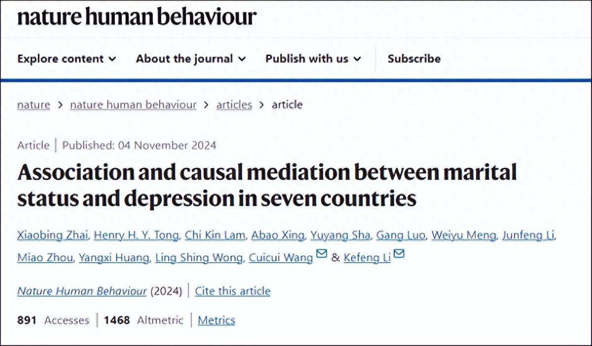 爲探索婚姻狀態與心理健康的關係,澳門理工大學研究者對美國、英國、墨西哥、愛爾蘭、韓國、中國和印度尼西亞7個國家進行了抽樣,總樣本數達10.6萬人。受訪者的婚姻狀態分爲四種:單身、已婚、離異/分居、喪偶。對他們進行4~18年的隨訪調查和數據分析後,研究者發現,無論在哪一國,非婚戀狀態(包括單身、離異、喪偶)患抑鬱症的幾率都顯著高於已婚者,超出約79%。這種風險在男性、教育程度較高者,以及西方國家中更明顯。比如,英美非婚狀態者患抑鬱的可能性高於中韓,尤其是離異人士;單身男性的抑鬱風險顯著高於單身女性。離婚或分居對心理健康影響相對更大,他們出現抑鬱症狀的風險比已婚者高出99%。