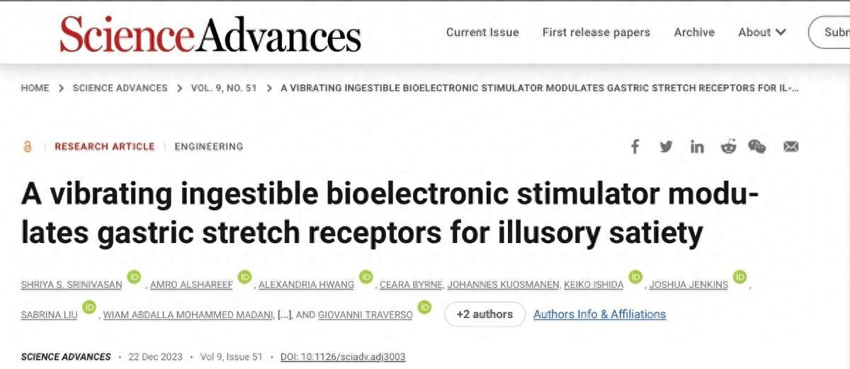 《科學》子刊上公開了麻省理工學院一項新發明:他們設計了一款可食用的振動生物電子刺激器,簡稱“Vibes機器膠囊”,通過在胃中振動激活生物體內的的機械感受器,產生一種虛假的飽腹感,進而降低食慾。