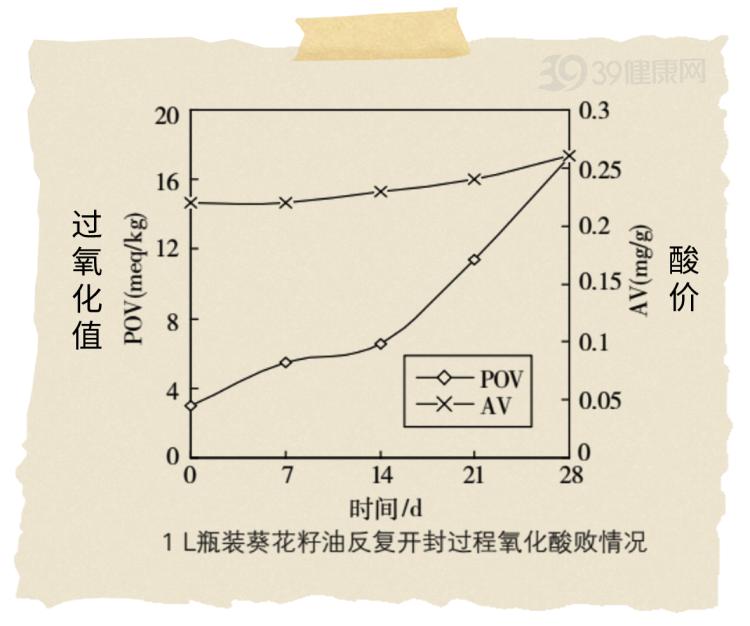 一項研究顯示,1升瓶裝的葵花籽油在反覆開封28天后,過氧化值漲幅506.71%,從開始的2.98 meq/kg狂飆到18.08 meq/kg,接近國家標準的上限—20 meq/kg。