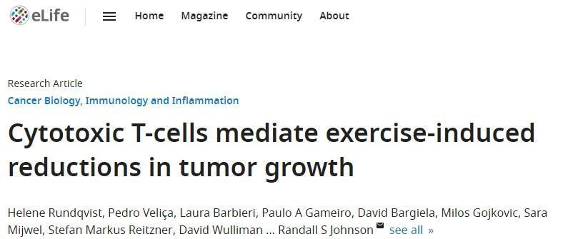發表在《eLife》雜誌上一項在小鼠身上進行的研究發現,帶瘤小鼠進行規律運動相較於不運動的,明顯腫瘤的生長速度較慢,死亡率也會明顯下降。