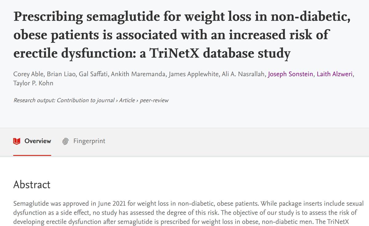 來自美國的醫學博士團隊,選取了3094名18-50歲的沒有糖尿病但在使用司美的肥胖男性,他們沒有任何ED相關問題或潛在影響因素(比如抽菸、喝酒、高血壓、高血脂等),結果發現ED概率增加了4.59倍。