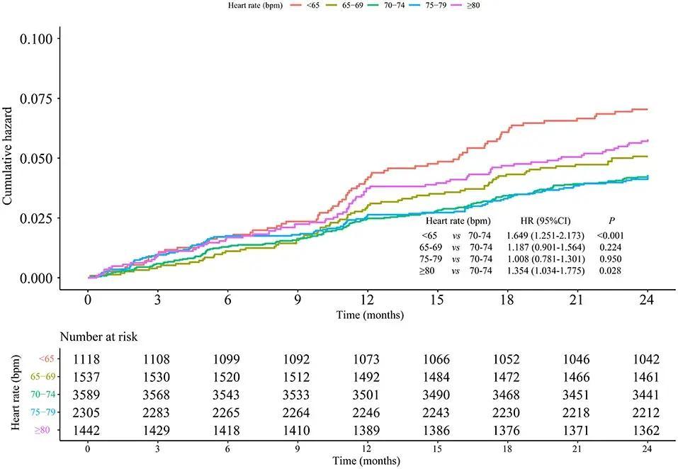 北京大學人民醫院孫寧玲教授等研究人員發表在Front Cardiovasc Med上的一項研究,納入了全國21個城市的110家高血壓中心的超1萬多名高血壓患者的數據,根據其降壓治療前的心率分爲5組,分別是心率<65 次/分、65 - 69 次/分、70 - 74 次/分、75 - 79 次/分以及≥80 次/分。