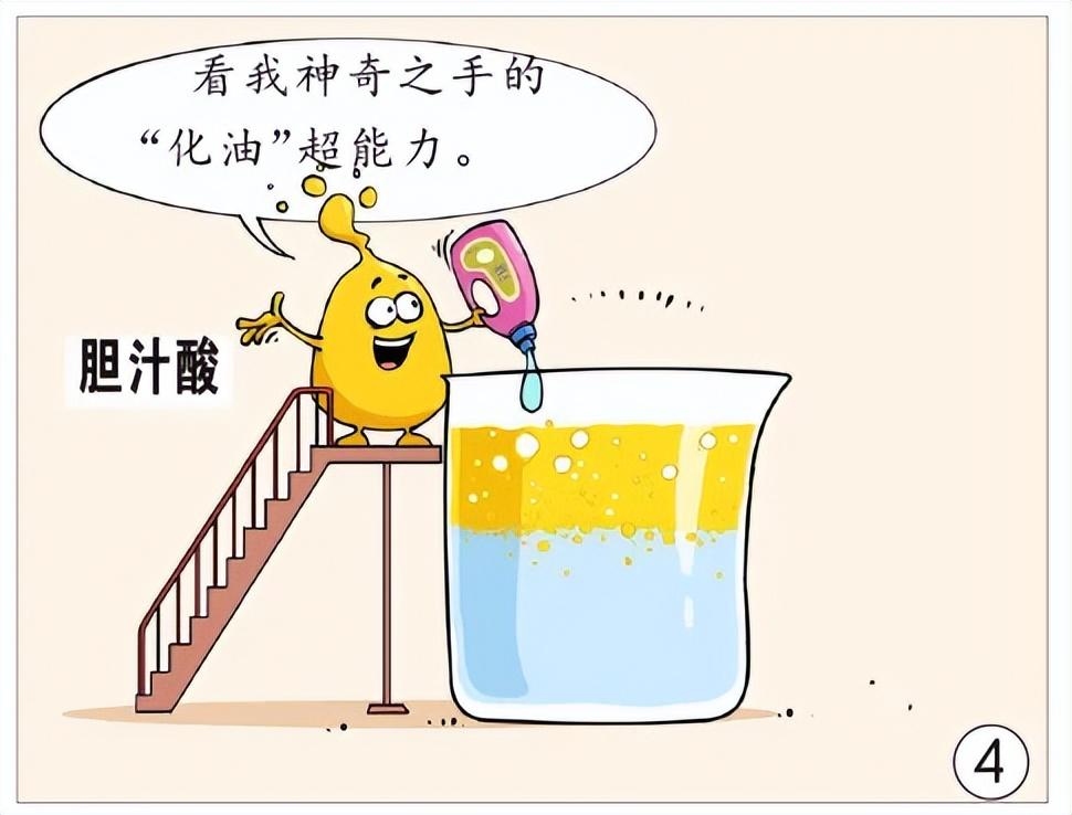 它能與甘氨酸或牛磺酸結合形成膽鹽,並像洗潔精一樣,將脂肪乳化成脂肪微滴,後續胰酶將脂肪微滴水解,膽汁酸又進一步將脂肪的水解產物變成脂肪微粒,微粒比微滴更小,從而幫助脂肪和脂溶性維生素在消化道中被吸收。