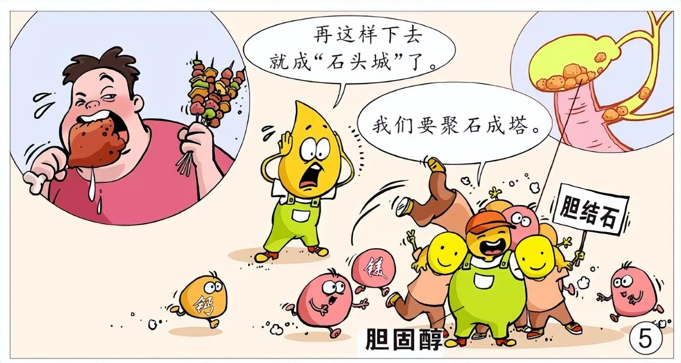 膽汁小分隊的成員平時相安無事,共同維繫着團隊穩定,但如果人長期暴飲暴食或喜食油膩食物,膽汁中的膽固醇會呈現飽和狀態,並與黏液糖蛋白、黏多糖、大分子蛋白、鈣和鎂離子等“抱團”,形成結石。