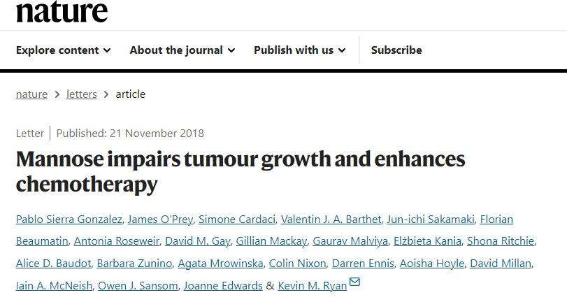 英國比特森癌症研究所的研究發現,甘露糖是一種天然生物活性單糖,化學結構與葡萄糖類似,進入體內後可起到“以假亂真”的作用。