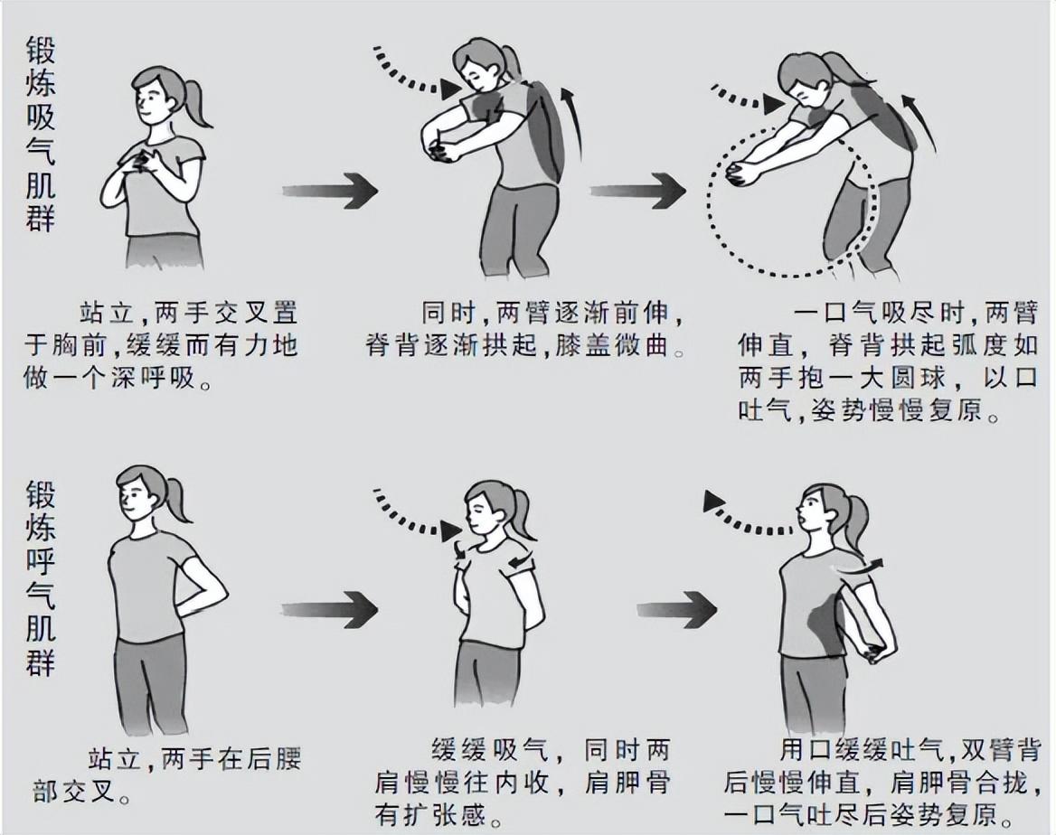現代人普遍呼吸淺,用到肌肉的次數少,相關肌肉退化。以下鍛鍊三步連續做完爲一遍,反覆做數遍至十幾遍不等,可量力而行,不便站立太久的老年人也可坐着做。