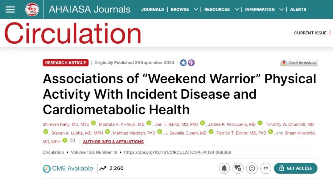 近日,一項發表於國際期刊《循環》的研究發現,將世衛組織建議的成年人每週至少150分鐘中等強度至高強度的運動量,集中在週末完成,可降低264種疾病風險,且收穫的效果與一週內分散運動模式相似。