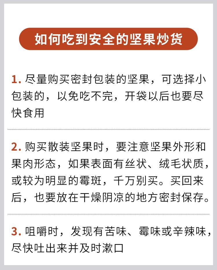 而且如果儲存堅果的地方高溫高溼,還容易黴變, 產生有害物質, 如花生就容易產生前文提到的黃麴黴毒素。這是1類致癌物,毒性是砒霜的68倍、氰化鉀的10倍。