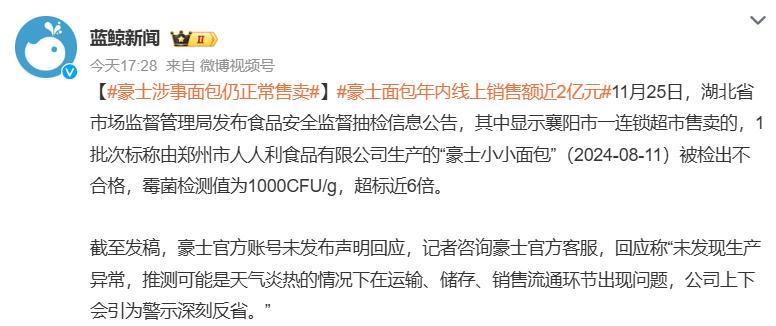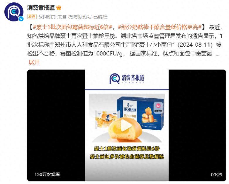 據@消費者報道,湖北省市監局在11月25日發佈的抽檢通告顯示,知名烘焙品牌豪士的產品“豪士小小麪包”(2024-08-11批次)被檢出不合格,黴菌檢測值爲1000CFU/g,超標近6倍。