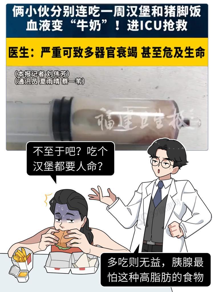 醫生一檢查結果發現是高脂性胰腺炎,抽出來的血液都變成了乳白色,像是“牛奶”一樣。隔壁牀的小夥也是因爲類似症狀入院,誘因則是連喫了一週的豬腳飯。