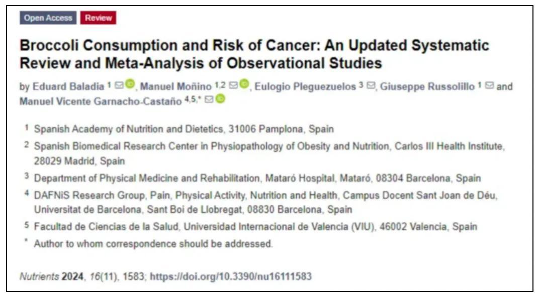 2024年,《營養素》上一則來自西班牙營養與飲食學會的研究人員的研究,通過分析超70萬人的數據後,發現多喫西蘭花與總體癌症風險下降11%有相關性。研究還指出西蘭花對特定部位癌症有益,比如胃癌、肺癌、膀胱癌、乳腺癌、結直腸癌、生殖系統癌。
