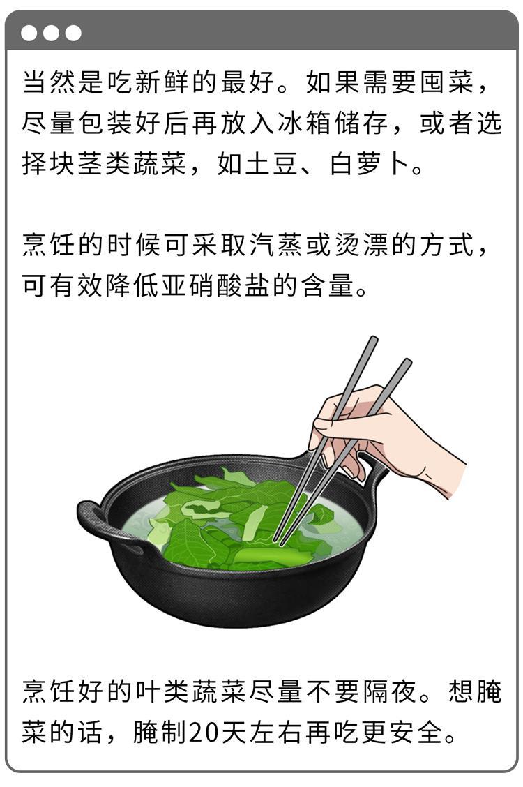 需要注意的是,醃製和烹飪後的隔夜蔬菜中,亞硝酸鹽含量也較高。