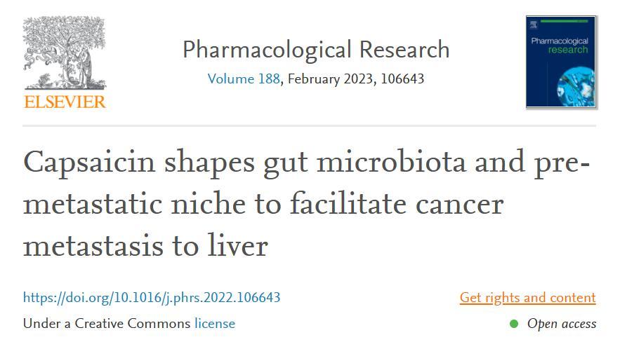 研究人員連續給小鼠餵食辣椒素飲食(300mg/kg),發現了促進肝臟轉移前小生境的生成,從而促進了結直腸癌細胞轉移。除了會改善腸道菌羣外,研究人員還發現辣椒素會改變粘液蛋白相關細菌的丰度以及參與膽汁酸代謝細菌的丰度,這會影響NKT細胞在肝臟內的募集,也會促進癌症轉移。