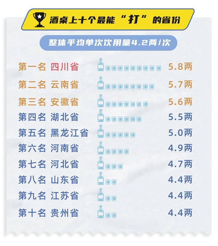 據《2021年中國白酒消費洞察報告》顯示:四川、雲南等十個省份,人均單次能喝4兩以上。