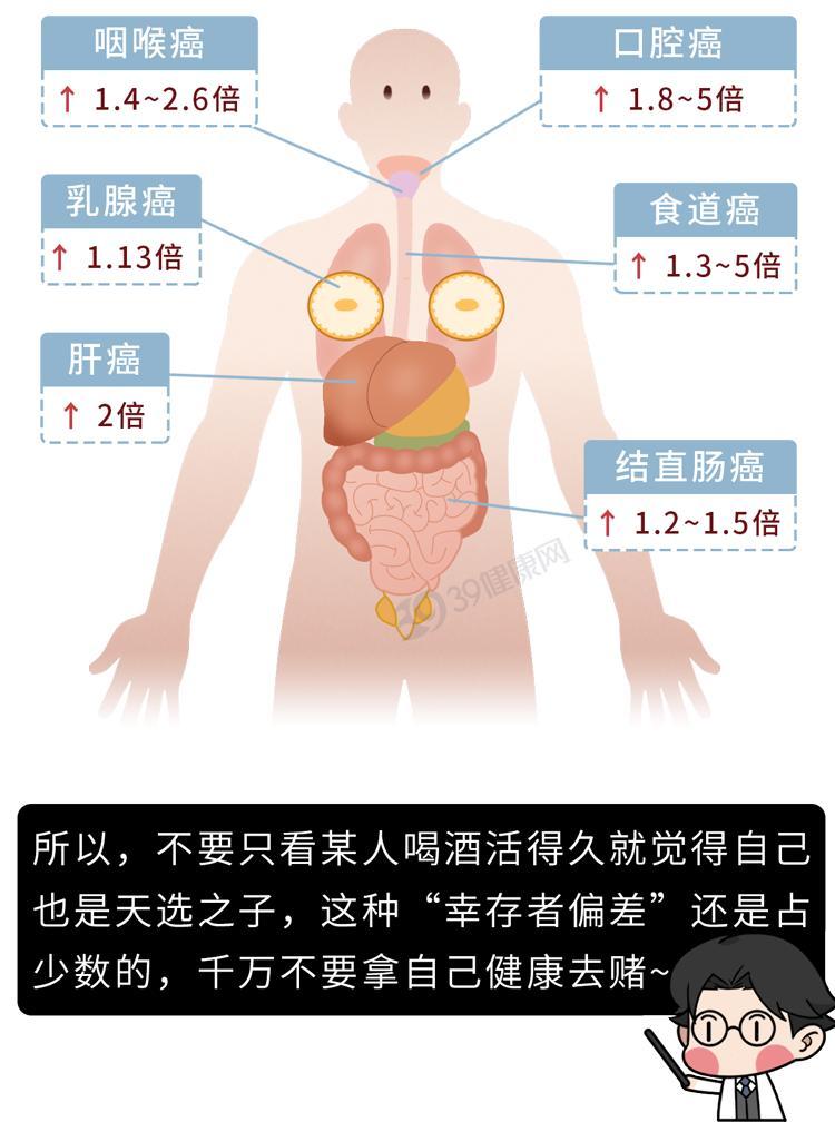 特別是而和滴酒不沾的人對比,喝酒的人患上以下癌症的概率都有不同程度的提升。