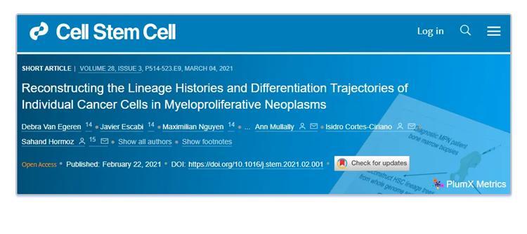 [1]DebraVanEgeren,JavierEscabi,MaximilianNguyen,ShichenLiu,Reconstructing the Lineage Histories and Differentiation Trajectories of Individual Cancer Cells in Myeloproliferative Neoplasms. Cell Stem Cell,2021,03,04:514-523.