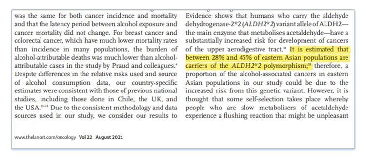 《2020年酒精緻癌報告》指出:包括中國在內的東亞人羣,攜帶乙醛脫氫酶突變等位基因(ALDH2*2)佔比高達28-45%。