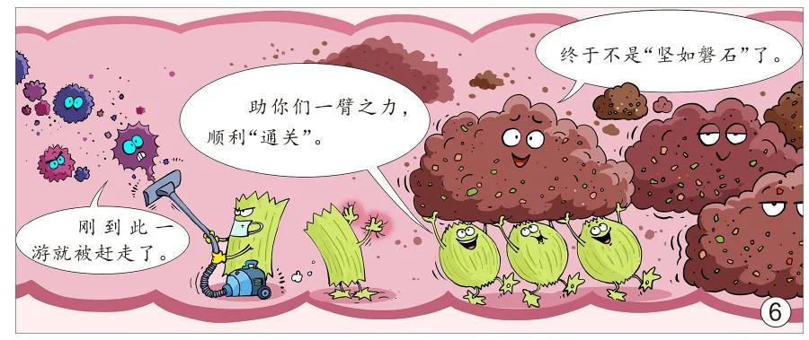 到了大腸後,膳食纖維會繼續開足馬力吸水,增加糞便中的水分含量和糞便容積,使大便變得鬆軟,同時刺激腸道蠕動,加快排泄。