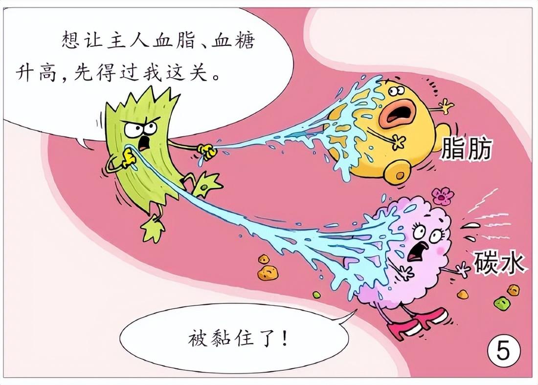 進入小腸後,具有黏性的膳食纖維會阻礙脂肪分子和葡萄糖快速被腸道吸收,從而控制血糖和血脂水平。