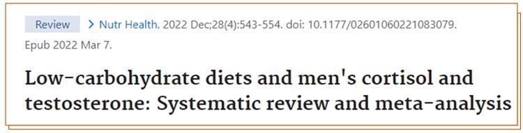 [1]Whittaker, Joseph, and Miranda Harris. “Low-carbohydrate diets and men''s cortisol and testosterone: Systematic review and meta-analysis.” Nutrition and health vol. 28,4 (2022): 543-554. doi:10.1177/02601060221083079.