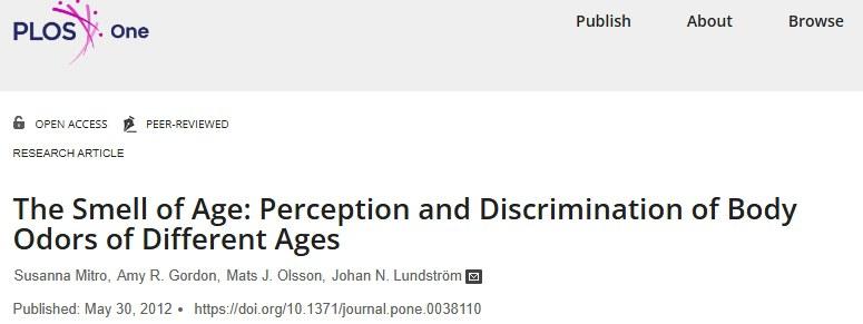 2012年《公共科學圖書館綜合》期刊中刊登的一項研究,首先將參與者分成年輕、中年和老年組,將他們連續穿着五晚的帶有腋下墊的衣物收集起來,並讓41位年輕人通過聞氣味樣品分辨供者年齡。