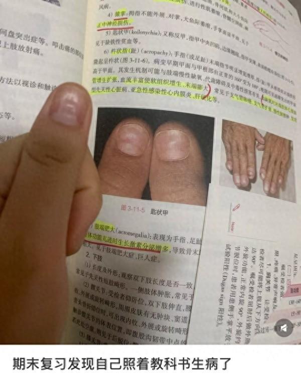 近日,山東淄博護理學專業的張同學在期末複習時,發現自己大拇指的指甲形狀和教科書上的病例圖片一模一樣,即指甲中間呈凹陷狀。教科書上註釋道,這樣的指甲叫做匙狀甲,很有可能是缺鐵性貧血導致。張同學當即決定前往醫院檢查。這則新聞引起了大量網友的圍觀,很多人不禁好奇,小小指甲爲何透露這麼多身體祕密?指甲上的其他表現是否也有玄機?