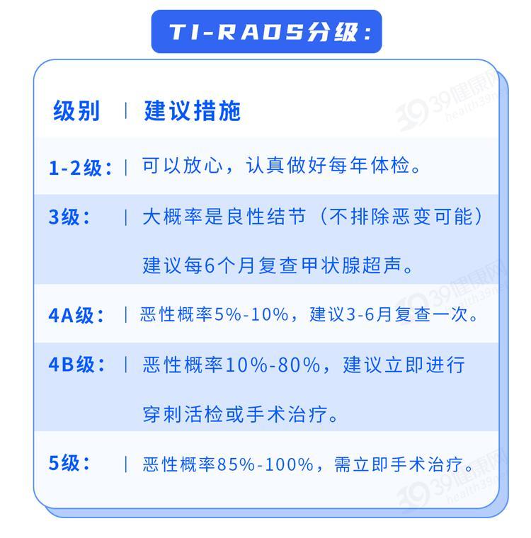 發現結節時,可以根據超聲診斷報告上的TI-RADS分類大致評估甲狀腺結節的良惡性。