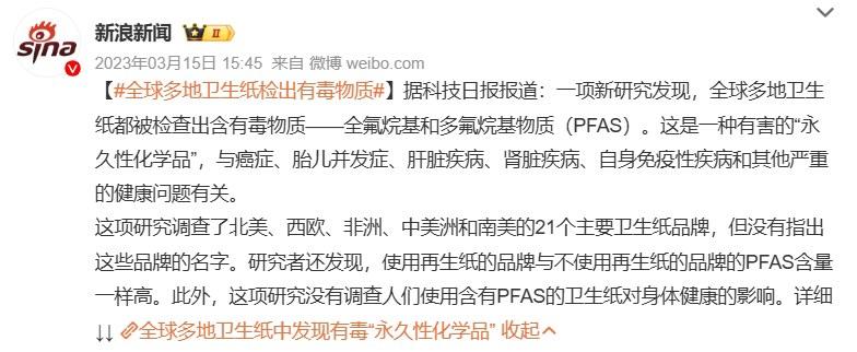 “科技日報”曾發佈過一項關於衛生紙的調查研究,發現全球多地衛生紙都查出全氟烷基和多氟烷基(PFAS)。可能大家對多氟烷基(PFAS)不瞭解,這種化學物質含有劇毒,被人體攝入後,會和血清蛋白結合,並引發肝臟、腎臟和睾丸、結腸等臟器系列疾病。