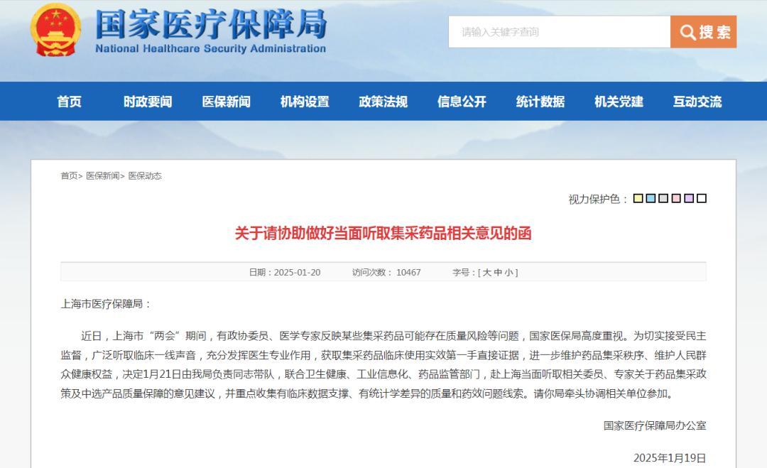就上海市部分政協委員反映的集採藥品質量參差不齊、藥效不穩定等情況,國家醫保局於1月17日發函,請上海醫保局聯繫提出提案的政協委員,代表國家醫保局致謝,並認真聽取專家意見,有效回應社會監督。