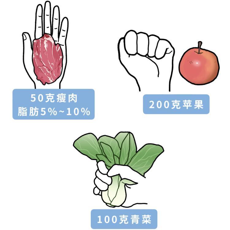 再評估一下果蔬的量,成年人每天蔬菜攝入量至少要達到300g(大概是3把綠葉菜),水果200~350g(大概是兩個拳頭大蘋果的量)。