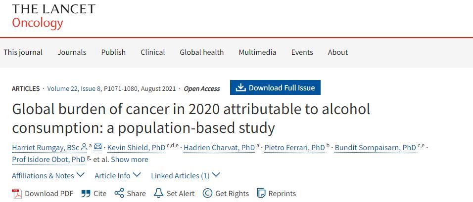 2021年7月,權威醫學期刊《柳葉刀》子刊明確發文指出,就算是少量飲酒也會對健康造成影響。研究人員對國際癌症機構全球2020數據庫內的數據進行了分析,並將受試者分成了三組,分別爲少量飲酒(每日平均<20g)、中等飲酒(平均每日20~60g)、大量飲酒(平均每日>60g)。