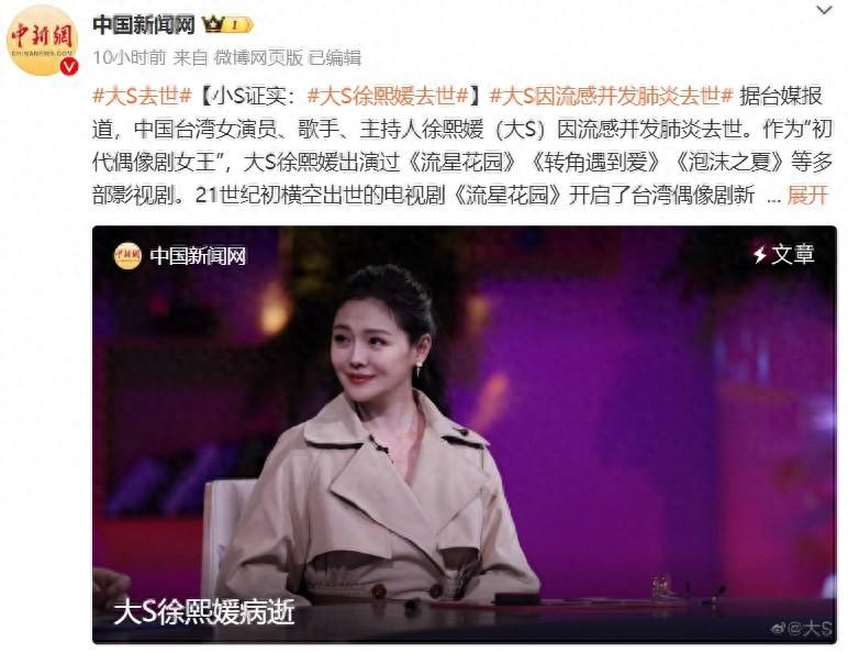 今日,臺灣知名藝人徐熙娣(大S)因流感去世的消息引爆熱搜。