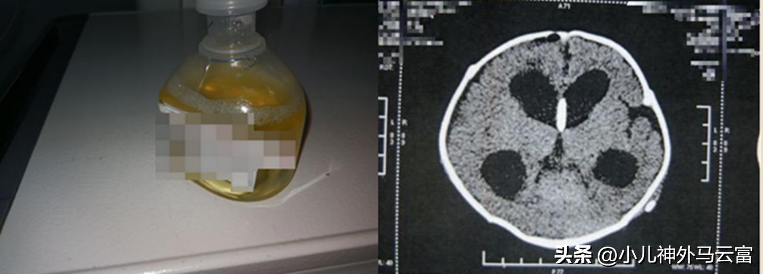 在兒內科治療的基礎上腦室腹腔外引流繼續進行(術後半月複查頭部CT腦積水明顯減少,腦組織逐步恢復如下圖,腦脊液引流顏色逐步變黃,每日引流量60-80毫升)