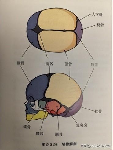 醫學上,嬰兒顱頂由額骨、頂骨、枕骨組成,顱頂各骨間由緻密結締組織形成的膜性結構相連接,即爲顱縫和囟門,如下圖所示。
