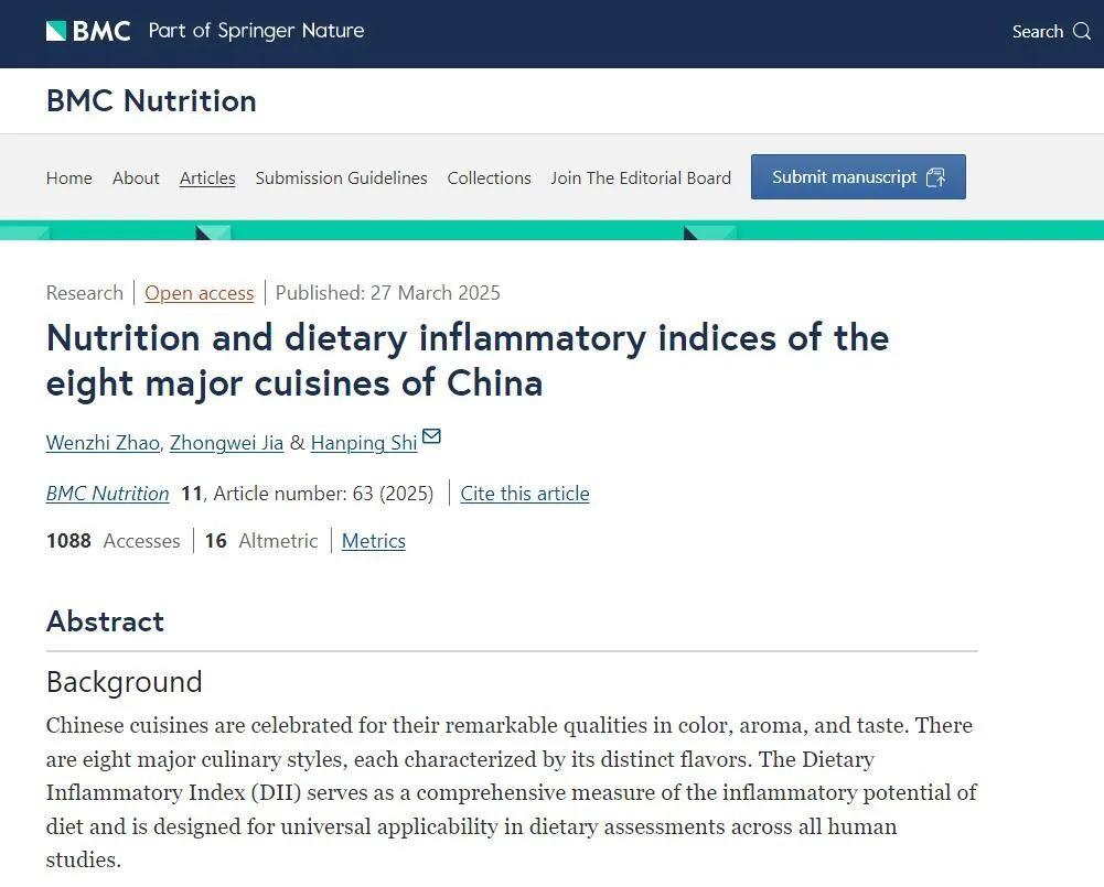 近日,首都醫科大學附屬北京世紀壇醫院研究人員發表論文,對中國八大菜系的營養和膳食炎症指數進行了全面分析。