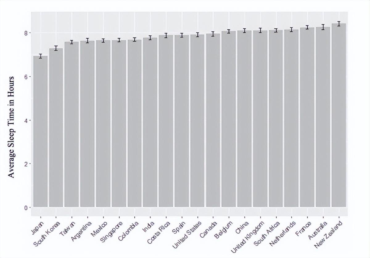 這項研究由加拿大不列顛哥倫比亞大學與維多利亞大學合作開展,研究人員對來自20個國家和地區的近5000名參與者進行了睡眠數據和健康情況的分析。結果顯示,不同地區的平均睡眠時長存在顯著差異。其中,最低的爲日本和韓國,平均睡眠時長分別爲6.933小時和7.292小時;最高的爲澳大利亞和新西蘭,平均睡眠時長分別爲8.263小時和8.42小時;美國的平均睡眠時長爲7.919小時,我國大陸地區的平均睡眠時長爲8.1小時;20個國家和地區整體平均睡眠時長爲7.864小時。具體見下圖:
