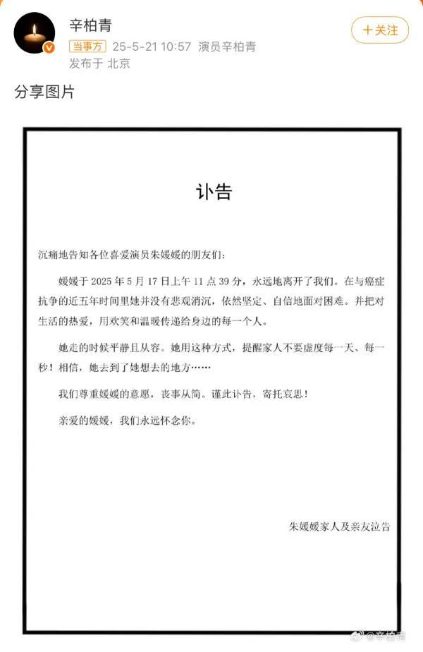 5月21日中午,國家話劇院發佈訃告,中國國家話劇院一級演員朱媛媛因病醫治無效於5月17日病逝,享年51歲。其丈夫辛柏青發布公開消息稱,朱媛媛已與癌症抗爭近五年時間。