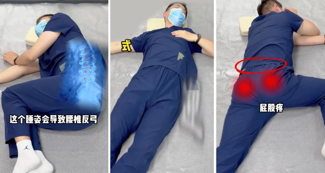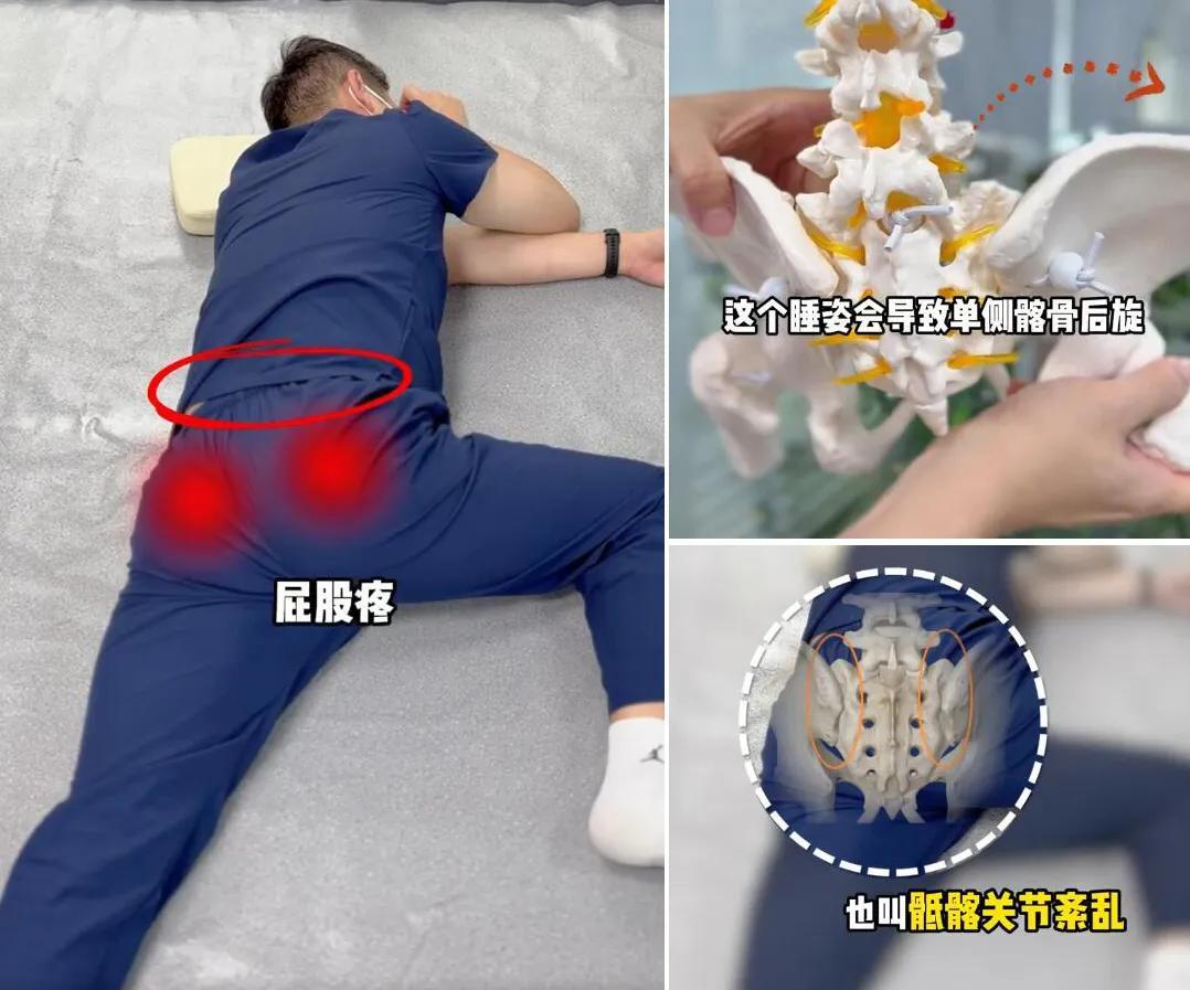 這一睡姿會導致單側髂骨後旋,時間長了,容易出現後腰兩側“腰窩”疼,也叫骶髂關節紊亂,表現爲腰痛、屁股痛、下肢串麻酸脹等不適。